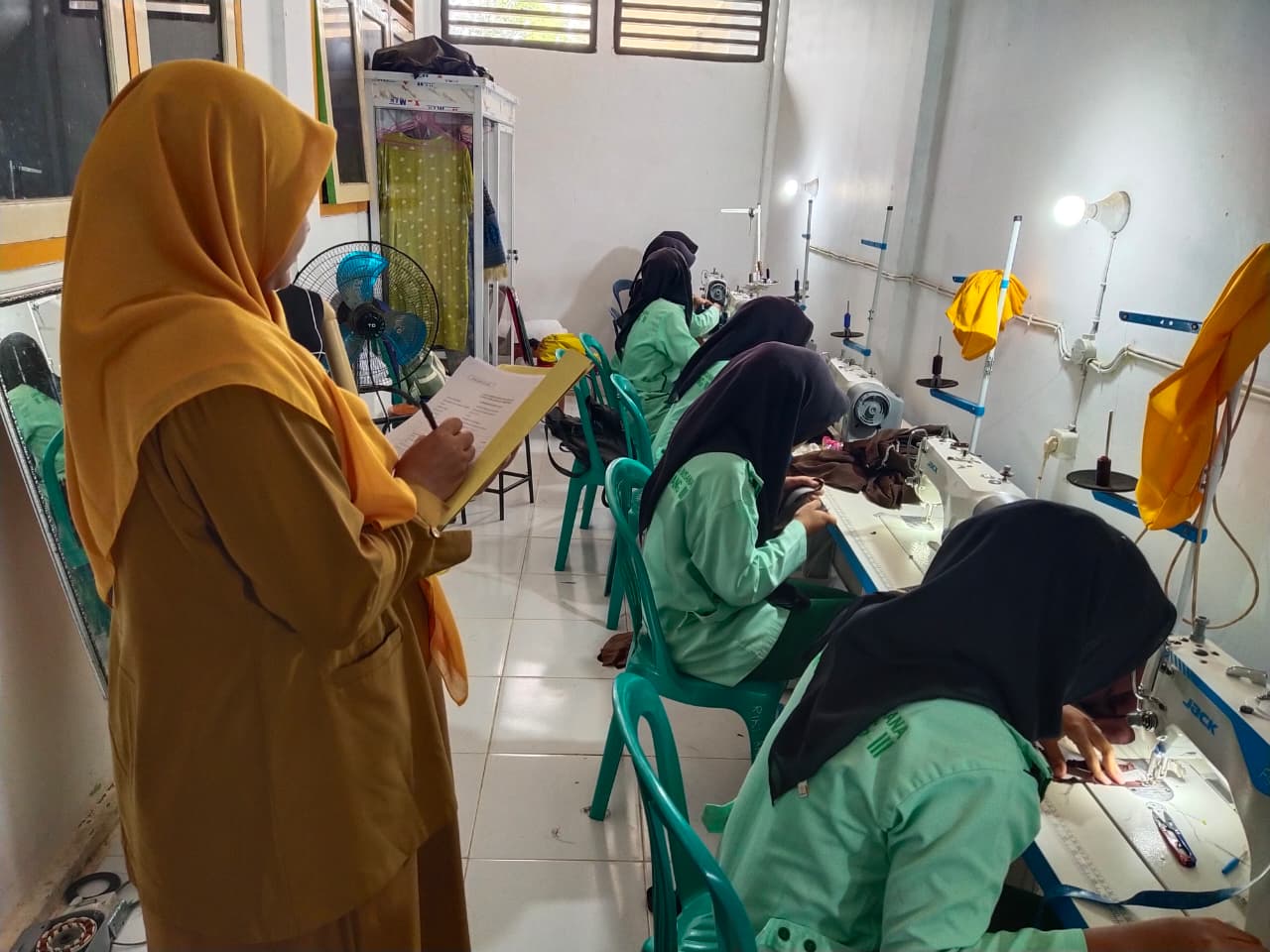 Hadir sebagai penguji eksternal profesional adalah Ibu Suprapti dan Ibu Yeni Rosalina, S.Pd. dari LKP Bumi Modiste. Kehadiran beliau berdua bertujuan untuk memberikan penilaian objektif terhadap seluruh tahapan produksi busana yang dilakukan oleh para siswa.